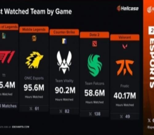電競體育12月17報道 今日外媒統計2025年度收視率最高戰隊(不包含大陸地區),具體如下: