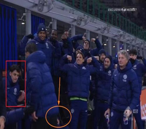 事情是這樣的,如下圖中黃色圓圈標記出的位置;在皮奧-埃斯波西托被替換下場時,直播鏡頭捕捉到了國米替補席這樣的一個有趣的一幕,大家都站起來模仿皮奧慶祝進球的動作,以表達對他的鼓勵、喜愛亦或者是調侃。但這里面唯獨少了一個人,誰呢?沒錯,狗哥特意為此會看了一遍比賽錄像,一幀一幀的看,發現這個位置坐著的人,正是勞塔羅。