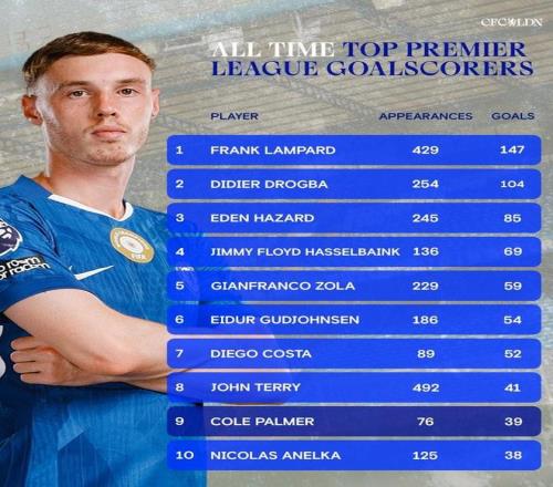 根據(jù)統(tǒng)計,到目前為止,帕爾默已經(jīng)代表切爾西在英超中打進(jìn)39粒進(jìn)球,超越阿內(nèi)爾卡,獨(dú)占隊史英超射手榜第9名。