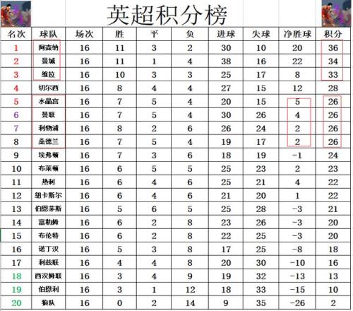 積分榜方面,第一階隊(duì)的三強(qiáng)咬的很緊,阿森納還是2分優(yōu)勢(shì)力壓曼城領(lǐng)跑,阿斯頓維拉差阿森納3分排在第3。爭(zhēng)5就更激烈,曼聯(lián)今天慘遭絕平,無(wú)力追上切爾西沖進(jìn)前5,現(xiàn)在爭(zhēng)5的四支球隊(duì)都是26分,曼聯(lián)凈勝球優(yōu)劣勢(shì),超過(guò)利物浦,排在水晶宮之后位列第6,利物浦被擠到第7。